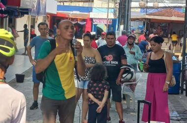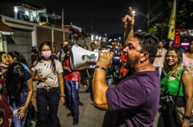 Aos gritos e som de tambores, apoiadores do candidato ao senado Jenilson Leite, lotam a entrada dos estúdios do ac24horas após a sabatina. Com entusiasmo