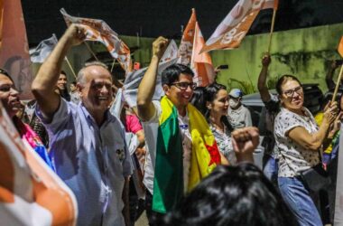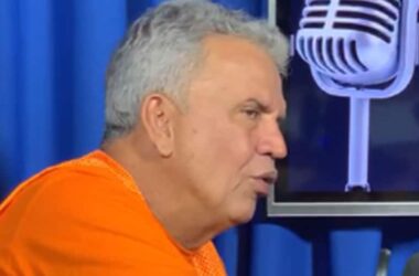 Abraçado por apoiadores e segurando a bandeira do Acre, Jenilson Leite chega aos estúdios do Ac24horas para mais uma noite de sabatina, que acontece até