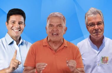 O governador Gladson Cameli, a sua candidata a vice, senadora Mailza Gomes, ambos do Progressistas, e o candidato ao senado da República, Ney Amorim (Podemos),