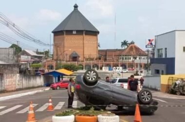 No início da tarde deste sábado, 27, depois da colisão de dois veículos, um deles capotou na descida do Morro da Glória, em Cruzeiro do