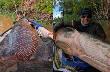 Dois pescadores fisgaram um pirarucu com mais 2 metros e aproximadamente 130 kg no Rio Madeira. Anderson Guedes e Wladis Kucharski contaram ao g1 que