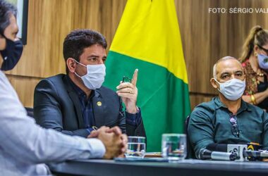 O governador Gladson Cameli, e os secretários Ricardo Brandão (Seplag) e Rômulo Grandidier (Casa Civil), reuniram a imprensa na manhã desta segunda-feira, 29, na sala