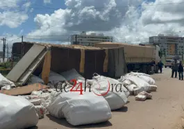 A extensão de uma carreta bitrem carregada de fardos de açúcar tombou na manhã desta terça-feira (3) na BR-364, nas proximidades da Loja Havan, em