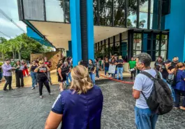 Servidores da saúde estadual fazem uma manifestação na Assembleia Legislativa do Acre (Aleac), na manhã desta terça-feira (18), em Rio Branco. A categoria pede a