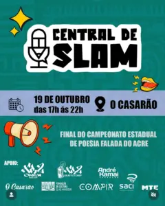 Neste domingo, dia 19 de outubro, o Casarão Centro, em Rio Branco, será palco da Final do Campeonato Estadual de Poesia Falada do Acre, reunindo
